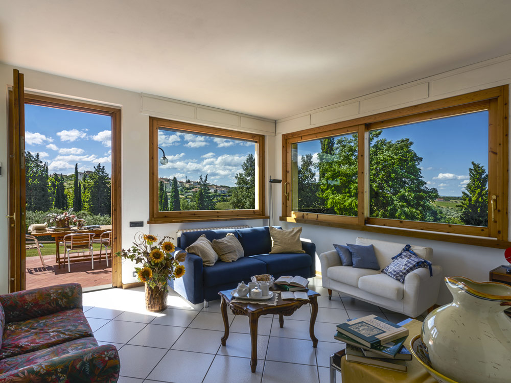 Spazioso appartamento su due piani, il piano terreno ha un grande e luminoso soggiorno con divano ed accesso al terrazzo privato, dotata di una grande e ben attrezzata cucina, una camera, un grande bagno con doccia e una sala da pranzo che può ospitare fino a 10 persone. Il primo piano è costituito da due camere matrimoniali, la prima con accesso al terrazzo ed un bagno con doccia, la seconda camera ha il bagno con la vasca. L'appartamento è fornito di lavastoviglie, piano cottura, forno, forno a microonde, frigo con freezer, tv schermo piatto, aria condizionata e riscaldamento, giardino e parcheggio privati, wi-fi gratis e tv satellitare. Nel raggio di 200 metri dall'appartamento si trova la fermata dell'autobus per le destinazioni di Firenze, Siena e San Gimignano.